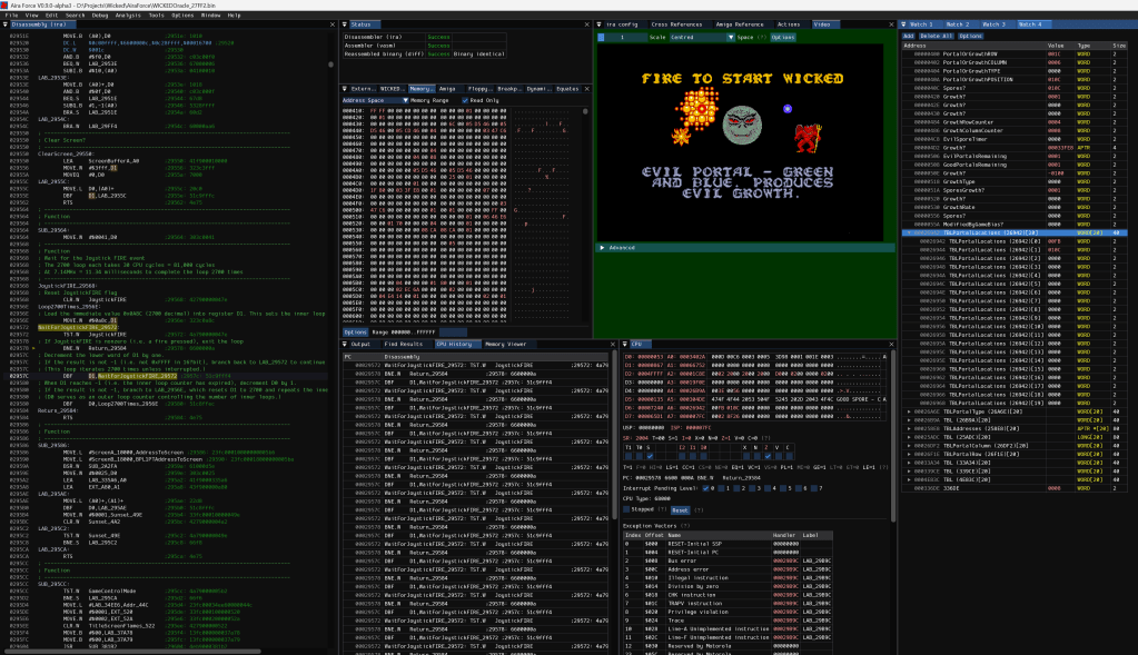 I cannot recommend AiraForce highly enough for disassembling Amiga Games. It is brilliant. My thanks to Howard Price for all the help and support with AiraForce, and for integrating some small requests into his program to really help me with disassembling Wicked. Go grab that from https://howprice.itch.io/aira-force